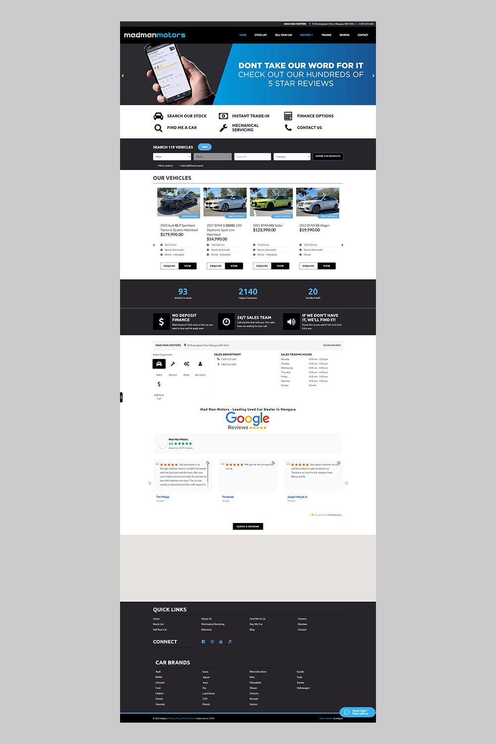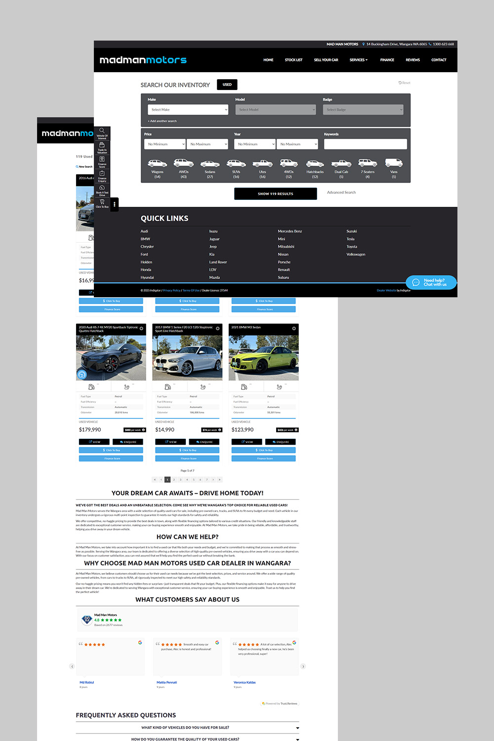 Madman Motors is a car dealership based in Perth, Australia, offering a wide range of quality used vehicles with trusted service and transparent pricing. Ahdaf Digital built their complete digital presence, including a modern, user-friendly website, SEO-optimized blog content, and targeted Google Ads campaigns. Our goal was to increase visibility, generate qualified leads, and enhance their online reputation helping Madman Motors connect with more customers and grow their business in the competitive automotive market.